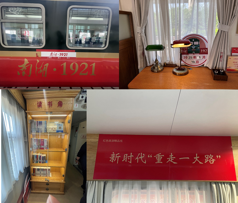 一早,支部党员在上海西站集合,准时登上“南湖·1921”红色教育主题列车。这趟列车采用10节编组,由普速列车改造而成,全车外部采用红、金、绿配色,车身上多处印有“南湖·1921”的标识字样。车厢内部装饰充满复古风格,座椅采用木质结构,铺设软垫,还原上世纪20年代风貌,窗帘上印有一大会址和嘉兴红船图案,车上还有百年前上海到嘉兴的列车时刻表以及两地的老照片。在列车上,大家仿佛穿越时空,回到了那个风云变幻的年代。车厢内的“南湖·列车初心邮局”和“读书角”等功能区域,为大家提供了丰富的红色文化体验。通过扫码参与在线课堂,大家观看了《长三角铁路革命之路》《建党精神》等青马课程,聆听了名校讲师讲授的党课,并积极参与党史知识答题。在交流分享环节,党员们围坐在一起,分享红色故事,畅谈学习感悟,气氛热烈而庄重。