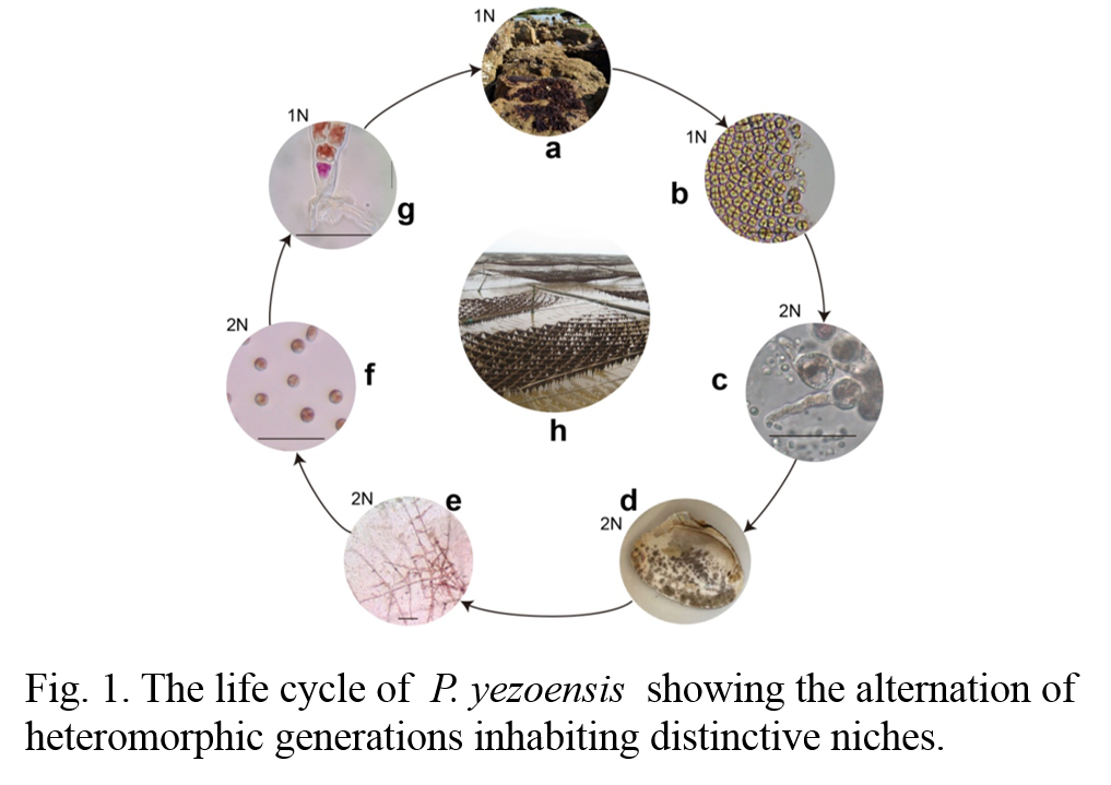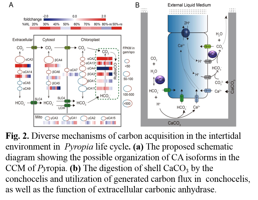 紫菜是重要的经济海藻,也是研究环境胁迫耐受机制的模式物种。紫菜等红毛菜目藻类具有典型的异形世代生活史,其叶状配子体世代定生于高潮带,历经潮起潮落过程中渗透压、温度、辐射等环境因子急剧变化的胁迫,而丝状孢子体世代则栖居于碳酸钙质的贝壳中。红毛菜目物种如何进化出形态不同且生境不同的两个世代?其叶状体世代为何具有强大的抗逆能力?丝状体世代在贝壳中如何获取足够无机碳?这些问题一直是藻类学研究中备受关注的科学问题。