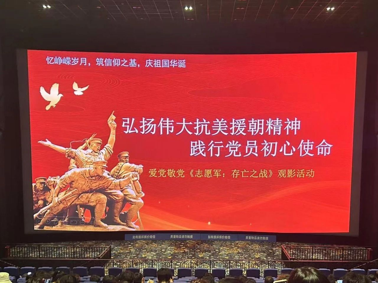 为庆祝中华人民共和国成立75周年,深入学习贯彻中共二十届三中全会精神,推动主题教育走深走实,增强党的凝聚力、战斗力,充分发挥党员先锋模范作用,切实落实立德树人根本任务,弘扬爱国主义精神和学习中国人民志愿军无畏斗争、不怕牺牲、艰苦奋斗精神,提升师生民族自豪感,激发爱国热情,Beat365官网党委于10月20日下午组织开展了“忆峥嵘岁月,筑信仰之基,庆祖国华诞”之观看《志愿军:存亡之战》主题党日活动。学院师生党员和学生入党积极分子等近200人参加。